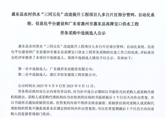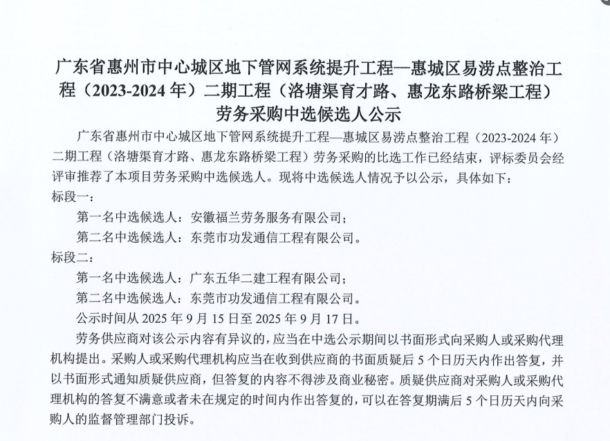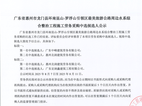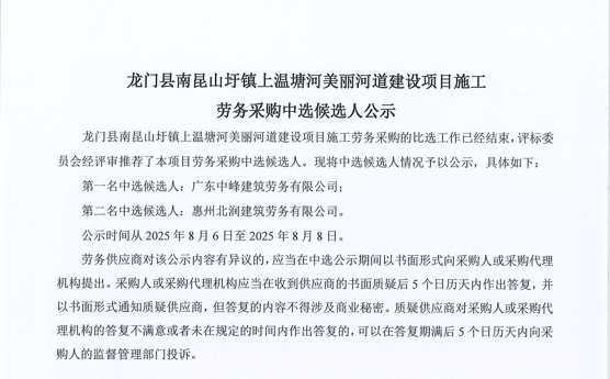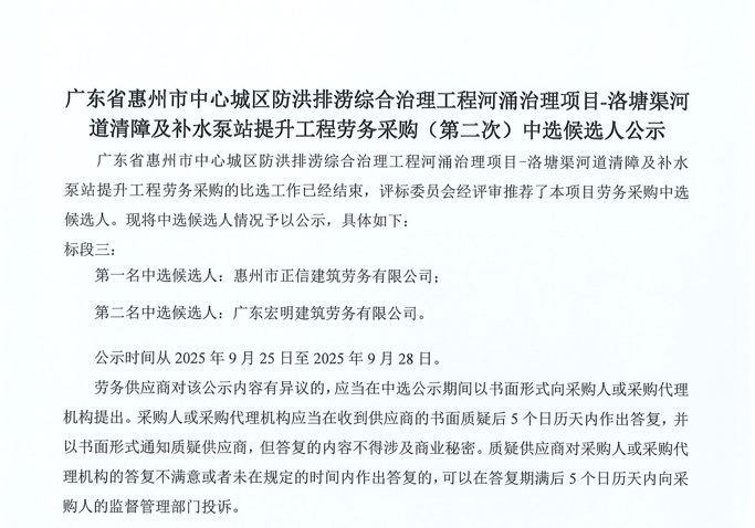 惠州市增江龍門段治理工程施工(一標(biāo)段)勞務(wù)采購中選候選人公示……